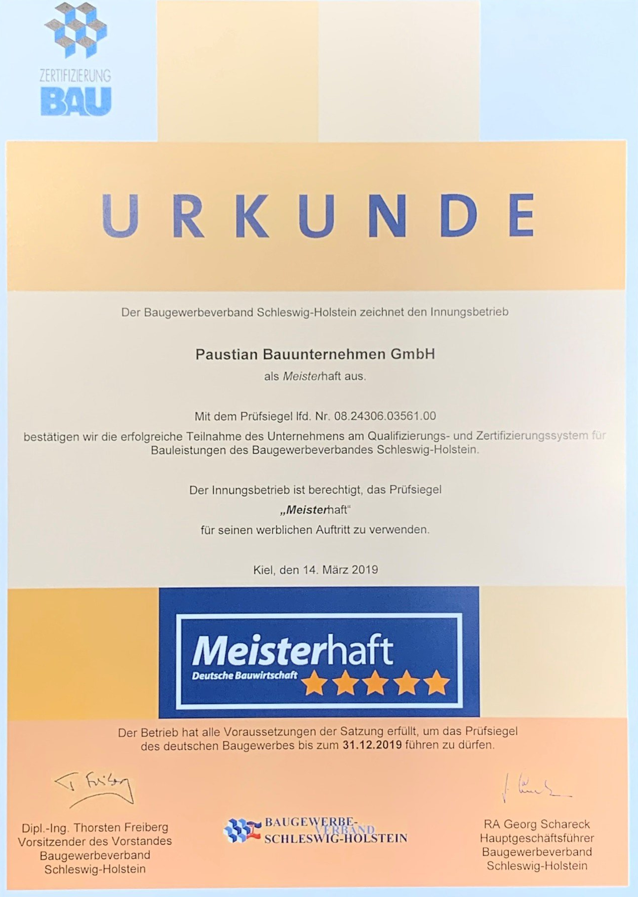 Mit Stolz haben wir heute bereits im zwölften Jahr unsere Meisterhaft 5 Sterne Urkunde vom Baugewerbeverband Schleswig-Holstein erhalten. Als einer der ersten Träger dieses Qualitätssiegels arbeiten wir stetig daran,dieser Auszeichnung auch in Zukunft gerecht zu werden.